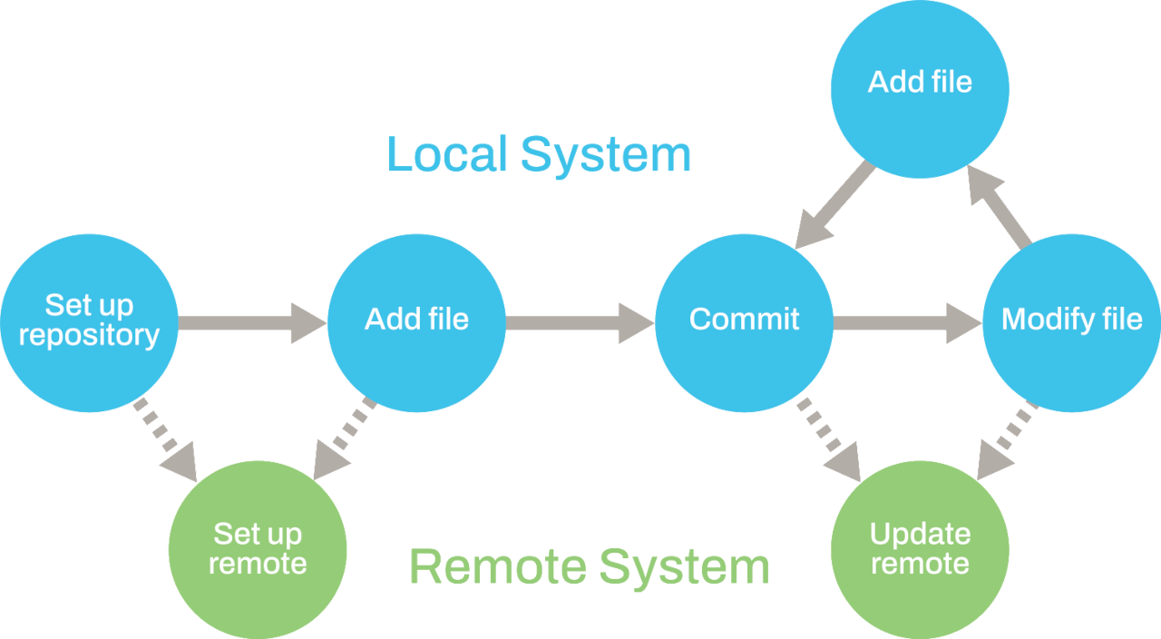 Version control software is designed to help you manage your file revisions. The software runs directly on your computer, allowing you to manage files within your local file system. You can also use version control software to interact with external copies of versioned files if you choose. Here we focus on the widely used open-source software Git. Git offers flexibility in how you can use it for version control. You can use it as a stand-alone tool to manage files on your own computer and, optionally, you can use it to connect to an external service to archive your files. Git can be used directly on the commandline, through other IDE software, or via standalone graphical programs (the official Git website lists several options1), so it is flexibly integrated into your normal workflow.